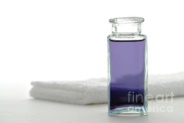 Aromatherapy scent essential oil extract clear bottle filled with lavender color liquid and bath towel in a spa