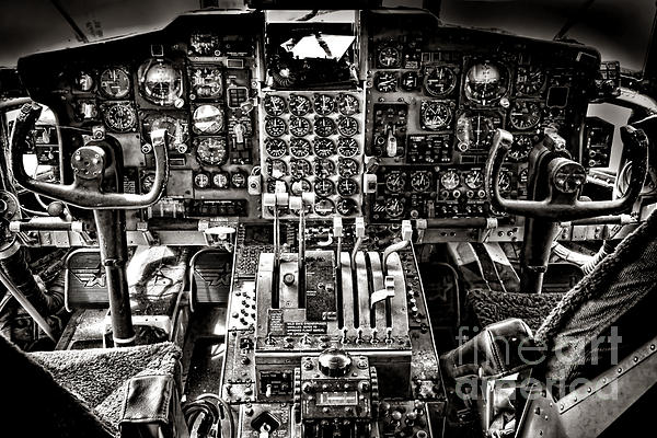 Vintage United States Air Force C130 Hercules military transport cargo plane interior flight cabin cockpit with original instrument panel and old style avionic gauges