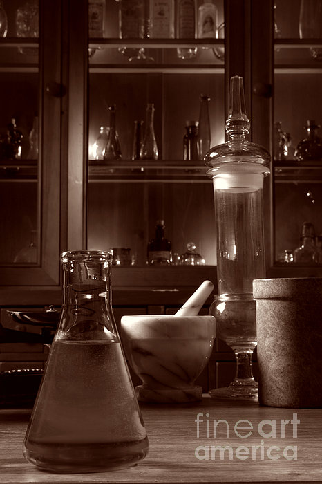 Vintage glassware and old pharmacy equipment in antique science research lab with apothecary style medicine case filled with ancient medical glass vials in nostalgic vintage sepia
